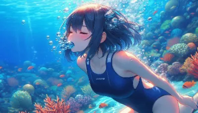 Detailed anime illustration: In the expansive depths of a vast blue lake, a girl with her hair styled in a high ponytail is seen plummeting towards the lake's bottom. Her simple indigo bikini, decorated with a floral design and hip frills, stands out against the dark waters of the lake. The surrounding environment is animated with air bubbles and dazzling light refractions, which paint a tranquil underwater picture. Best Quality.