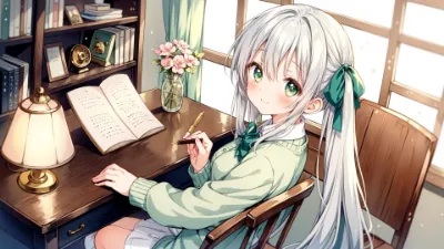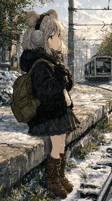 白銀の髪をなびかせた少女が、冬の電車窓辺でホットドリンクを手に微笑む。外は雪景色が広がり、遠くの森が静かに佇む。彼女は故郷への旅の途中、幼い頃の思い出を振り返りながら、心温まるひと時を過ごす。温かな飲み物の蒸気が、窓ガラスに優しい霧を描き、そこで新たな冒険の予感が芽生える。読み手は、彼女の瞳に映る雪の物語を想像せずにはいられない。