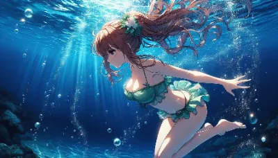 Detailed anime illustration: In the expansive depths of a vast blue lake, a girl with her hair styled in a high ponytail is seen plummeting towards the lake's bottom. Her simple indigo bikini, decorated with a floral design and hip frills, stands out against the dark waters of the lake. The surrounding environment is animated with air bubbles and dazzling light refractions, which paint a tranquil underwater picture. Best Quality.