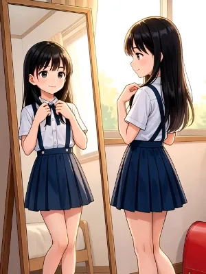 朝はまず初めに、姿見の前で身だしなみのチェック。 今日も可愛いです。 こういう何気ない仕草が好きです。 --- 鏡を使った実験イラストです。正直、いきなり姿見(全身)はハードル高かったです。 手鏡くらいから始めればよかった。 色々と残念なところはありますが、左胸のポケットは反転しているのでヨシとします。
