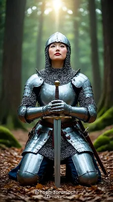 A Japanese woman in her twenties is wearing Western armor from around the 13th century. Her expression is serious, and her slightly parted mouth exudes determination. Her eyes glare at the enemy ahead, allowing no hesitation. She is wearing a brigandine, a piece of chain mail partially fitted with iron plates. The chest, shoulders, elbows, and knees are reinforced with polished iron plates, giving the surface a dull shine characteristic of well-worn metal. These iron plates are supported by leather and fabric fastened with rivets, the heads of which are neatly arranged on the outside. The helmet is a bassinet helmet, and the visor covering her entire face is flipped up, giving a clear view of her face. Chain mail collars are attached to both sides of the helmet. She is posed as if she is ready to face the enemy on the front lines of a battlefield. She raises her right arm high, in a dynamic movement, just before swinging down her giant war hammer. Her left foot presses firmly against the ground, while her right foot is pulled lightly back. Her gaze is sharp, fixed on the path of the hammer. The composition is a mid-shot, focusing on her upper body, expressing her strength. The lighting, streaming in from the dim sky before the storm, creates sharp highlights on the metal parts of her armor, creating an overall atmosphere of solemn tension. In the background is a muddy battlefield after the rain, with a burning fortress visible in the distance. Broken arrows and scattered weapons lie at her feet.