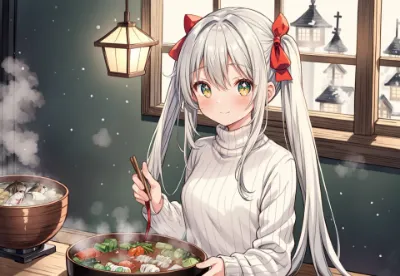 (masterpiece:1.2), best quality, ultra detailed, high resolution, 1girl, long flowing silver twin-tails slightly damp with subtle gold ribbon:1.3, emerald eyes looking at viewer with gentle loving smile and soft blush, cheeks flushed from bath, wearing cozy oversized warm hoodie trainer (light gray with soft fleece lining, modestly covering body), medium-large breasts naturally prominent but fully covered, sitting on bed with warm blanket around waist, holding small yuzu fruit in hand, faint steam rising from skin and hair, soft bedroom lamp lighting, gentle snow falling outside window, heartwarming post-bath winter night atmosphere, anime style, glossy finish, dreamy warm orange-yellow tones, <lora:add_detail:0.7>