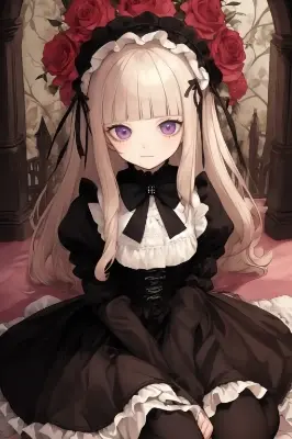 masterpiece,best quality,realistic, photorealistic, best quality , ultra detailed, highres, extremely detailed,(Rozen Maiden:1.4),(1girl:1.2),extremely detailed eyes and face, eyes with beautiful details,(gothic lolita:1.5),(blunt bangs,brow:1.7),sitting,wariza,