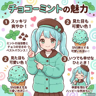 チョコミントの部屋でくつろぐ白髪の少女。彼女はアイスクリーム屋の娘で、今日もお店の新作を試食中。ふわふわのコートに身を包み、緑の瞳を輝かせて一口かじる瞬間。外は雪が舞う冬の日だが、この部屋は甘い香りに満ち、彼女の小さな冒険が始まる。どんな味の秘密が隠されているのか、想像してみて。