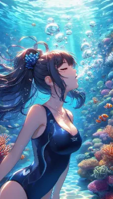 Detailed anime-style image of a girl of Asian descent unable to hold her breath while swimming at the bottom of the Coral Sea. She is wearing a sleek competitive sleeveless dark blue swimsuit and has long flowing hair with high ponytail. She appears to be exhaling or struggling underwater, with many bubbles escaping from her mouth. The underwater scene is filled with vibrant light patterns from the sun colorful fish. She closes eyes.She is completely upside down Best Quality
