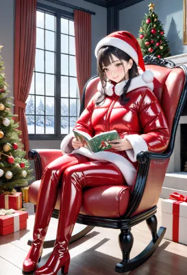 (photorealistic:1.4), (RAW photo), masterpiece, best quality, extremely detailed, lady, neat and clean, elegant, polite, (shy:0.9), dark blonde wavy long hair, almond eyes, (smile:0.9), Santa's cap, slim fit, full sleeves, high necked, (closed zipper:0.9), (red rubber bodysuit), BREAK, (shiny red short puffer down jacket:1.3), (red patent leather platform long boots:1.3), standing pose, (high angle shot:0.6), holy night, snowfall, illuminations, Christmas tree, beautiful cathedral, many people in the background