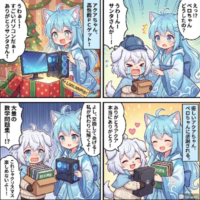 クリスマスの夜、水色の猫のサンタがトナカイのそりに乗り、お菓子の街を駆け抜ける。カップケーキの家々が輝く中、プレゼントを届ける冒険が始まる。甘い香りが漂う街で、動物たちが喜びの声を上げる。星空の下、このファンタジックな世界で、誰もが夢見る瞬間が訪れる。サンタ猫の優しい笑顔が、冬の夜を温かく照らす。