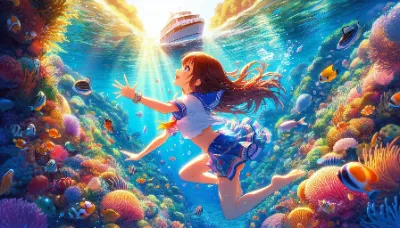 A close-up anime-style image of a girl of Asian descent lying on the sea floor next to a coral reef. She appears unable to hold her breath, with her eyes closed and small bubbles escaping from her slightly parted lips. Her long hair styled in a ponytail, floats around her. She wears a sleek neckhold sleeveless neon pink swimsuit with front zipper. The vibrant underwater environment includes colorful coral reefs and dappled light patterns reflecting off her skin. Best Quality.