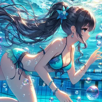 Detailed anime-style image of a girl of Asian descent unable to hold her breath while sinking at the bottom of the Coral Sea. She is wearing a sleek competitive sleeveless red swimsuit and has short, flowing black hair with high ponytail. She appears to be exhaling or struggling underwater, with many bubbles escaping from her mouth. The underwater scene is filled with vibrant light patterns from the sun, colorful fish. She closes eyes. She is caught by giant clum shell.