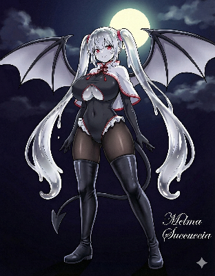 イラストのキャラクターをGペンでペン入れする。2D。カラー。強めの影とコントラスト。線は細く薄くする。フラット。バストとヒップがとても豊満。キャラクターの特徴をそのままに、ポーズを完全に変更。腰が細い。背が低い。遠近感を持たせる。衣服はそのまま。大腿まで届くゴム製の長靴を履いている。夜、カーテンが開いている。寝室ではベットで人影が寝ており、キャラクターはその隣に両手を背後に回して立っている。スライムの質感と透明感向上。顔もスライム。窓の外は満月。キャラクターは目を閉じた笑顔で、寝ている人影に顔と視線を向けて見ている。背中を見せる。グラデーションを追加。