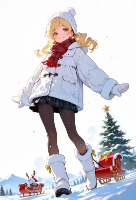 白い雪が舞う冬の森で、金髪の少女は小さなそりを引いて歩く。彼女は街はずれの小さなサンタで、星型のツリーの下に隠されたプレゼントを運んでいる。冷たい風が頰を撫でる中、少女の瞳には温かな願いが輝く。遠くの街灯りが灯る頃、誰かの笑顔を想像しながら、彼女の冒険は続く。雪の足跡が語る、心温まるクリスマスの物語。