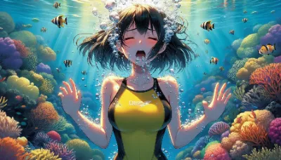 Detailed Anime illustration: A serene school pool with shimmering turquoise water. A girl with long, black hair tied up in a sleek ponytail swims gracefully. She is dressed in a simple metallic light blue bikini with a floral pattern and is floated, with bubbles and mesmerizing light refractions enhancing the scene. Best Quality.