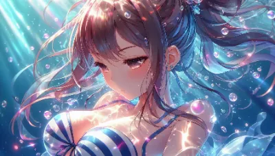 Detailed anime-style image of a girl of Asian descent unable to hold her breath while sinking at the bottom of the Coral Sea. She is wearing a sleek competitive sleeveless pink swimsuit and has short, flowing black hair with high ponytail. She appears to be exhaling or struggling underwater, with many bubbles escaping from her mouth. The underwater scene is filled with vibrant light patterns from the sun, colorful fish. She closes eyes. She is caught by jerryfish.