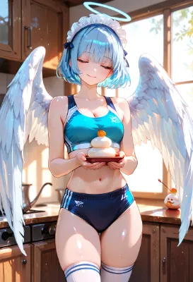 masterpiece, best quality, masterpiece, masterpiece, best quality, ultra detailed, woman, plain and charming, angel halo, white big wings, black hair, glasses, a little fat, headdress, white T-shirt, buruma, shiny thighs, thigh high socks, gentle and focused expression, calm smile, quiet atelier interior, wooden floor, shelves with art supplies, angel carefully painting a daruma face with a fine brush, ink and paint tools neatly arranged, soft natural light entering through a window, dust motes in the air, peaceful and contemplative atmosphere, sense of concentration and craftsmanship, warm neutral color palette, soft shadows, cinematic lighting, serene, wholesome, artistic slice of life illustration