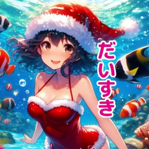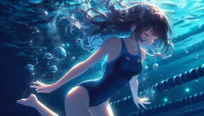 Detailed anime-style image of a girl of Asian descent unable to hold her breath while sinking at the bottom of the Coral Sea. She is wearing a sleek competitive sleeveless silver swimsuit and has short, flowing black hair with high ponytail. She appears to be exhaling or struggling underwater, with many bubbles escaping from her mouth. The underwater scene is filled with vibrant light patterns from the sun, colorful fish. She closes eyes. She is caught by jerryfish.