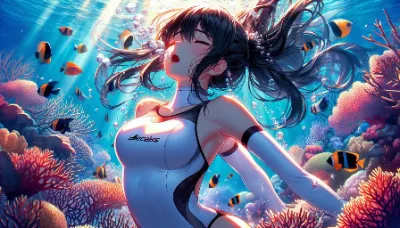 Anime-style image of a girl descent on the bottom of a deep pool, struggling to hold her breath, with her eyes closed. She is wearing a sleek competitive sleeveless violet swimsuit, has middle long hair, and is sinking headfirst, completely upside down. Many air bubbles are escaping from her mouth, indicating she is struggling. The underwater scene is vibrant, illuminated by light patterns from the sun.Best Quality.