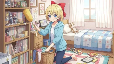 2girls,small girls,one with blond hair,blue eyes,short hair,bob hair,(hair bow:1.4),large red bow,the other with black hair,short hair,one head taller than the first,(hair bow:1.4),large red bow,extremely delicate and beautiful faces,detailed eyes,the black-haired girl with gentle smile placing hand on the blond girl's head,the blond girl with pouting expression,puffed cheeks,furrowed brows,small breasts,casual home clothes with simple patterns,standing close together,black-haired girl standing straight with one arm extended downward touching head,free hand at side,legs shoulder-width apart,feet in indoor slippers,blond girl looking up with head slightly tilted under the hand,arms crossed over chest,legs together with slight stomp pose,from head to toe full body view,cozy indoor living room background,soft natural light from window,detailed furniture and rugs,warm atmosphere,(masterpiece:1.2),best quality,very aesthetic,absurdres,