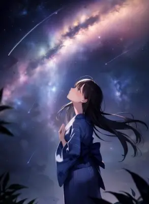 absurdres, best best quality, highres,1 girl, looking back, invitation,(praying:1.1) , dark hair, ( looking up:1.1), colorful yukata, (starry sky:1.1), milky way, (banboo leafs:1.1),gazing stars, (at night:1.1)