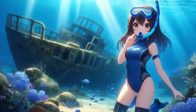 Anime illustration: Set against the expansive blue of the coral ocean, a girl with a high ponytail is swimming. She is wearing a simple metallic blue bikini adorned with a floral pattern and a hip frill, along with a diving mask, a snorkel, and fins. The scene is enriched with air bubbles and the dance of light refractions across the underwater landscape, highlighting the beauty of the ocean. Best Quality.