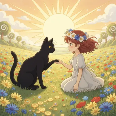 masterpiece, best quality, high resolution, ultra-detailed, 8k, a cute young girl, short stature, petite, holding hands with a black cat, in a flower field, under a blue sky, summer scenery, refreshing atmosphere, vibrant colors, soft lighting, detailed background, intricate details