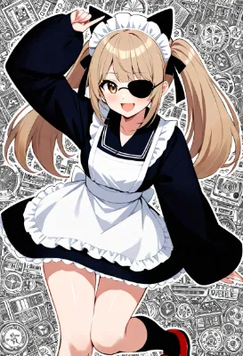 Please generate an illustration of a randomly dancing model with poses based on Shimiko's outfit in this image as the theme. Make the poses as diverse as possible within the theme. Scatter Japanese manga-style onomatopoeic sound effects across the background. Use textured and effect fonts for the onomatopoeia that reflect the image theme's uniqueness, personality, distinct history, and emotion. Shape the onomatopoeia fonts creatively to interpret the image theme. Create truly unique and expressive typography using fonts relevant to the image's theme. The background should be dotted with elements related to the theme's shape. Please create a single image without splitting the screen. Make it a delicate image in an anime style. Okay! This is Shimiko's self-introduction! My charm points are my light brown hair covering one eye and my big, pointed animal-like ears! My visible eye is gray. Also, my body is tiny, but I wear a white apron-like thing over black clothes! I wear a black leg warmer on just one leg, and my shoes are stylish black and white ones! How about it? Cute, right? Hehe! I have a little silly hair strand sticking up on my head. My hair is straight, gray, and shoulder-length. I wear big, ribbon-like cat ears hanging down behind my head. My bangs are shaped to hide my cheeks, and I have twin tails tied with black ribbons at the ends. I wear a white headband on my head. Her bangs are long enough to almost cover her right eye, but the hair in front of her left eye is shorter so it's clearly visible. She has droopy eyes. She speaks slowly with a slight accent. She wears distinctive, foreign-style maid accessories on her body, head, clothes, hair, ears, hands, and feet. She's a character with a modest bust and minimal skin exposure, giving her a simple, unassuming look. , , <lora:noline:1> <lora:hairdetailer:1>