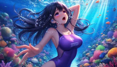 A detailed anime-style close-up image of a girl descent underwater. The image captures her upper torso and face depicting her struggling to hold her breath. Her short hair moves around her in the water. She is exhaling with some bubbles escaping from her mouth. She wears a sleek competitive silver swimsuit. The lighting reflects the underwater environment with vibrant dappled light patterns reflecting off her skin. She closes eyes. She is completely upside down.