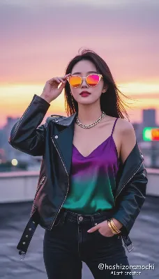 A Korean female, in her 30s. Editorial fashion shoot. She is standing in front of a white concrete wall. She is wearing an oversized mint green blazer, a lavender turtleneck with a geometric print and yellow accents, and coral pink wide-leg pants. She is wearing large round sunglasses with clear frames and light blue lenses. She has large acrylic earrings with a neon yellow and pink marbled pattern. She is posing with one knee bent, her weight on one foot, her hands in her blazer pockets, and her shoulders forward. Her face is straight ahead, her expression is cool and neutral, the shot is from a high angle, the colors are a mix of pastel and neon, the light is soft and natural, there is minimal shadow, and the atmosphere is minimal and modern. Shot with a Sony a7R IV, the image is sharp, the lighting is even and there are few shadows.