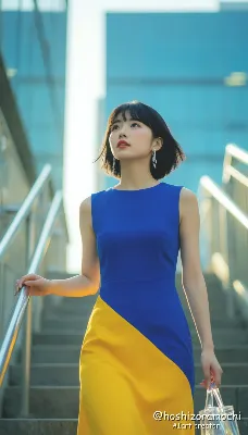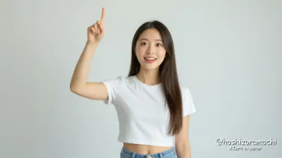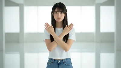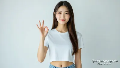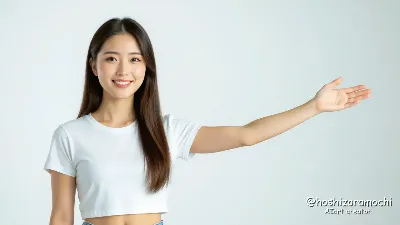 A Japanese woman in her twenties stretches comfortably with her right arm raised high, her long straight hair flowing down her back, her eyes closed and relaxed expression, her right hand stretched high above her head and her left hand grasping her right elbow, her face tilted slightly upwards and her gaze angled upwards, her posture straight and chested, her body angled at a 45-degree angle, the hem of her fitted white cropped short-sleeved cotton T-shirt slightly raised to expose her navel, contrasting with her denim shorts, against a pure white background, minimalist modern style, uniform and bright lighting, medium shot centered from the waist up, with space on both sides.