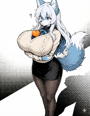 イラストのキャラクターをGペンでペン入れする。2D。カラー。濃いスクリーントーンを貼っている。強めの陰影とコントラスト。線は細く薄くする。バストとヒップがとても豊満。キャラクターの特徴をそのままに、ポーズを完全に変更。キャラクターはウサギのケモノ。腰が細い。小柄。毛並みはモフモフ。遠近感を持たせる。衣服はそのまま、白いニーハイブーツを履いている。瞳孔は白いハート。キャラクターは顔だけ後ろを向いて、背後に両手を回している。キャラクターを背後から見る。背景は白。グラデーションを追加。 ▶︎ 左上の空白に、大きく大文字かつ墨の行書体で縦に「最上 次字」と書く。ルビは小さく縦に「モガミ ジジ」と書く。