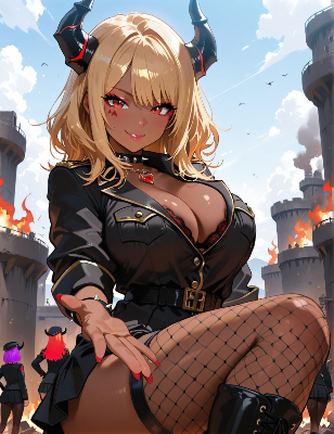 tomboy, cat girl, cat ears, red hair, red eyes, smile, big breast. BREAK military uniform, black jacket, chest pocket, collared shirt, red necktie, black cargo pants. BREAK hand on hip, upper body, from side, indoor, chandelier, looking at viewer.*加筆修正をしている為、このまま入力しても出力されない可能性があります