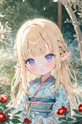 今月は あまり投稿できませんでした。。。 ----- 額縁の中の花乙女 金髪の少女が額縁に閉じ込められたように佇む。 紫の花が髪を優しく飾り、 青い瞳が儚い光を映す。 暗い背景に花びらが舞い、 幻想的な静けさが広がる。