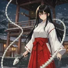 masterpiece, best quality, high quality, ultra-detailed, highres, 4k, absurdres, illustration, high detail, newest, snow falling on New Year's Eve night, temple bell tower, striking the bell for the New Year's Eve ceremony, serene and solemn atmosphere (1.2), a girl, 18 years old, cute, solo, date in the temple, soft lighting, cozy atmosphere, wind-blown hair, medium hair, bow-shaped hair, black hair, red eyes, cute smile (1.1), duffel coat, ornate, long skirt, pantyhose, knee boots