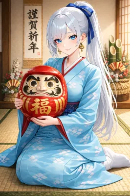 New Year shrine visit, traditional Japanese temple, torii gate covered in snow, winter sky, ringing the bell, hanging ema plaques, sacred ropes and white paper streamers, lanterns glowing softly, serene and respectful atmosphere