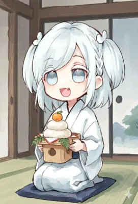イラストのキャラクターをGペンでペン入れする。2D。白黒。背景に濃いスクリーントーンを貼っている。強めの陰影とコントラスト。線は細く薄くする。バストとヒップがとても豊満。キャラクターの特徴をそのままに、構図とポーズを変更する。キャラクターを右側面から見る。黒タイツの質感向上。キャラクターから眠気の泡が出ている。キャラクターは手袋を外して椅子に座り、箸を持って善哉を食べている。前方に木製のテーブル。背景は蔓草模様の壁と外が白い窓。鞄を肩に掛けていない。「たぷっ♡」と小さく効果音を書く。完全に新しいイラスト。グラデーションを追加。 ▶︎カラー。善哉に矢印を向けて「善哉」と手書き文字で示す。キャラクターは髪色が白色、肌が白色、お椀の色は茶色、善哉の色は餡子色。