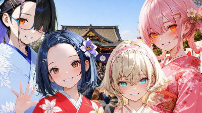 雪化粧した富士山の麓で、白い着物を纏った金髪の少女が、優しく微笑む。頭に赤い花飾りを付け、傍らにだるまが並ぶ部屋で、彼女は新年の訪れを祝う。遠い異国から来た旅人か、それともこの地の守り神か? 穏やかな陽光が差し込み、彼女の青い瞳に未来の冒険を映す。どんな物語がこの瞬間から始まるのだろうか。