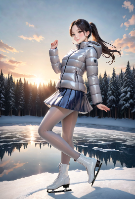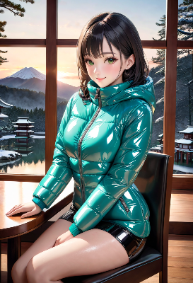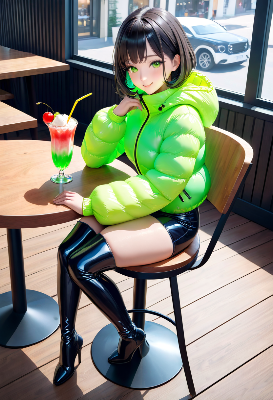 (photorealistic:1.4), (RAW photo), masterpiece, best quality, extremely detailed, lady, neat and clean, elegant, polite, (shy:0.9), black medium long hair, almond eyes, (smile:0.9), slim fit, high necked, (closed zipper:0.9), (shiny light turquoise blue puffer life vest, shiny light turquoise blue short puffer down leotard, turquoise blue elbow length gloves, turquoise blue thigh high boots:1.2), Hawaii island, Waikiki beach, sit on white deck chair, (holding tropical cocktail drink), (high angle shot:0.6), good view, resort hotel buildings, palm trees, diamond head, cold blue sky