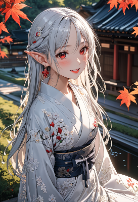 雪降る森の奥で、白髪のエルフ少女が雪だるまたちと戯れる。彼女の赤い瞳が輝き、軽やかな着物が風に舞う。幼い頃の思い出を蘇らせるこの瞬間、少女は雪の精霊に願いを込めて微笑む。やがて訪れる春の訪れを前に、永遠の友情を誓う冬の冒険。読み手は、彼女の秘密の物語に思いを馳せるだろう。