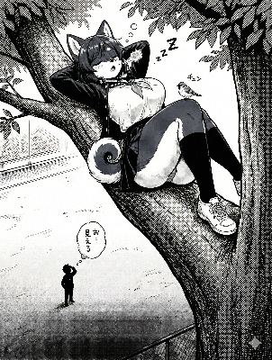 イラストのキャラクターをGペンでペン入れする。2D。白黒。背景に濃いスクリーントーンを貼っている。強めの陰影とコントラスト。線は細く薄くする。バストとヒップがとても豊満。キャラクターの特徴をそのままに、構図とポーズを変更する。キャラクターを側面から見る。黒タイツの質感向上。キャラクターは座布団に割座して目を閉じてうつらうつらと眠り、人影に膝枕する。人影は仰向けになってキャラクターの膝枕に平行に頭を置く。フラッシュ吹き出しに、二段落で「前が 見えねェ」と入力。木のフローリングの上に白のラグを敷いた部屋。キャラクターは眠気の泡を出し、いびきをかいている。「たゆんっ♡」と小さく効果音を書く。肩に掛けられた鞄を削除。完全に新しいイラスト。グラデーションを追加。 ▶︎陰影はペン書き。身体の両側に両手を下ろす。フラッシュ吹き出しをもう一個追加して、二段落に分けて「重(ルビ:おも)ッッ 軟(ルビ:やわ)ッッ」と入力。