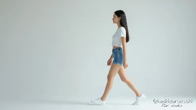 A Japanese woman in her 20s running in profile view against a pure white background, minimalist modern style. She wears a white cropped half-sleeve fitted t-shirt, denim shorts, and white sneakers. Her long straight black hair streams behind her horizontally, frozen in dynamic motion. Side view composition capturing her right side, running from right to left. Both feet are off the ground in mid-stride showing athletic running form, right leg extended forward with bent knee, left leg pushed back with toes pointed. Her arms pump vigorously with left arm bent forward at 90 degrees and right arm bent backward. Her torso leans slightly forward with engaged core showing athletic posture. Expression shows focused determination with eyes looking straight ahead, mouth slightly open breathing naturally. Her body creates a powerful diagonal line suggesting speed and energy. Photographed from a side angle at waist height to emphasize the dynamic running pose. Bright even lighting eliminates harsh shadows while maintaining subtle ground shadow for spatial awareness. The pure white seamless background amplifies the sense of motion and freedom. Sharp focus on the subject with perfect exposure showing fabric movement and muscle definition. Ultra-clean commercial photography style ideal for fitness and lifestyle stock imagery.