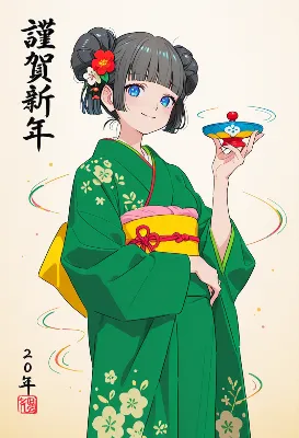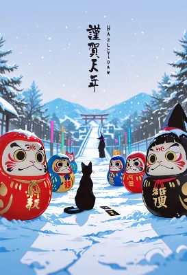 masterpiece, best image quality, ultra-detailed, high resolution, 4k, 8k, Anime Style, Japanese, A formal Japanese New Year's card, Happy New Year, Typography & layout section with "Happy New Year" in bold text at bottom right of text area (1.2), Above Tokyo, Snow Scenery, Snowfall, Snow Scenery park, depth of subject, cute, the black cat from the witch wizard, usual black cat, background of a little witch with long dark hair, kagami mochi (New Year rice cakes)