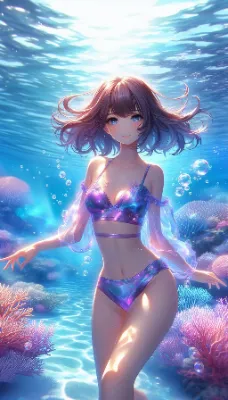 Create an anime-style image of a girl swimming in a coral reef. She should have a gentle and relaxed expression, with her middle short hair flowing around her in the water. The two-piece swimsuit should have a metallic, violet sheen, with realistic light reflections that suggest movement and depth. The underwater view should show a clear blue pool with light patterns reflected on the bottom of coral reef. The overall atmosphere should be serene and ethereal. Best Quality.
