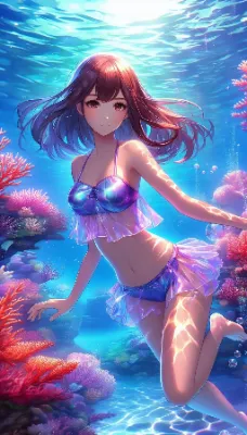 Create an anime-style image of a girl swimming in a coral reef. She should have a gentle and relaxed expression, with her middle short hair flowing around her in the water. The two-piece swimsuit should have a metallic, violet sheen, with realistic light reflections that suggest movement and depth. The underwater view should show a clear blue pool with light patterns reflected on the bottom of coral reef. The overall atmosphere should be serene and ethereal. Best Quality.