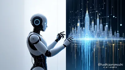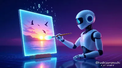 A friendly, rounded AI character draws on a tablet floating in the air. Colorful lines emerge from the tablet, transforming into a realistic flower field, a cat, and a flying fish. The AI's eyes are soft light blue LEDs, and light trails leave trails from its hands. The background is a gradient of pale lavender and mint green, with delicate lines reminiscent of neural circuits floating here and there. The composition places the AI at the center, and the generated image radiates out in a dynamic flow, expressing an explosion of creativity.