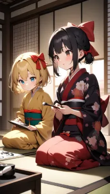1girl,solo,(blonde hair:1.2),(blond hair:1.2),(blue eyes:1.3),(short hair:1.2),(bob hair:1.2),(hair bow:1.5),(red bow:1.5),young girl,delicate features,focused expression,slight smile,medium breasts,(white kimono:1.2),red obi,traditional Japanese clothing,kneeling,seiza position,sitting on tatami mat,legs folded under body,both hands preparing calligraphy tools,ink stone in front,calligraphy brush in right hand,water dropper nearby,white paper scroll laid out,proper posture,straight back,toes pointed behind,(indoor Japanese room:1.2),tatami floor,shoji screen background,wooden low table,calligraphy set,ink stick,suzuri inkstone,traditional New Year atmosphere,soft natural lighting from window,peaceful room,kakejiku hanging scroll on wall,simple interior,calm atmosphere,(kakizome preparation:1.4),New Year calligraphy scene,traditional culture,(masterpiece:1.4),(best quality:1.4),(very aesthetic:1.3),(absurdres:1.3),