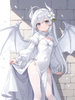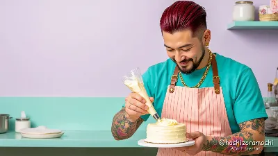A Japanese woman, 28 years old, with a wide-open, surprised and happy expression on her face, sparkling eyes, curly shoulder-length bob hair with a gradient of orange, pink, and lime green, large hairpins on the sides, an apron made of mustard yellow fabric with large blue-purple polka dots, a thick peach-pink choker around her neck, arms spread wide in an open pose as if to say "Wow!", a wooden rice paddle in her right hand and a coral red potholder in her left hand, her face facing forward but looking up slightly, her posture slightly bouncing as if expressing joy with her whole body, a turquoise blue wall in the background with yellow and magenta cooking utensils, several bead bracelets of different colors on her wrist, and purple measuring spoons lined up in the pockets of her apron.