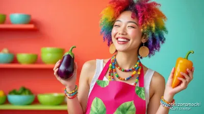 Japanese man, 29 years old, with an intelligent and curious expression, one eye wide open with an observing gaze, medium-length messy hair with ash gray and electric purple mesh, bangs swept to one side, lime green apron with shocking pink chemical formulas and molecular structure diagrams printed on it, test tube-shaped pendant around neck with fluorescent orange liquid inside, several small silver studs in left ear, right hand holding clear beaker to eye level to check its contents, cobalt blue dropper in left hand, face tilted diagonally upwards, staring at the beaker, body sideways but aware of the camera over his shoulder, background is magenta pink wall with yellow and turquoise kitchen tools, metallic blue ring on finger, thermometer and timer peeking out from apron pocket, fluorescent green Crocs on feet.