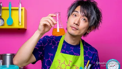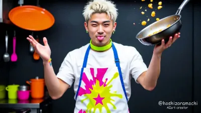A Korean female, in her 30s. She has a philosophical expression gazing into the distance, a mysterious smile with the corners of her mouth slightly turned up, long straight hair with a gradient that changes from burnt orange to crimson and finally dark purple, loosely braided on the side, an apron made of apricot orange fabric with a cobalt blue and gold geometric pattern, a multi-layered turquoise and coral bead necklace around her neck, large brass crescent earrings in both ears, she is holding a wooden mortar at chest height in her right hand and a pestle in her left hand as she grinds spices, her eyes are looking diagonally downward into the mortar, her face is slightly shifted from profile to the front, her body is standing in a gentle S-shape, saffron yellow and rose pink spice jars are lined up against a deep teal wall in the background, several thin gold bangles are on her wrist, and peacock blue wide pants can be seen peeking out from the bottom of her apron.