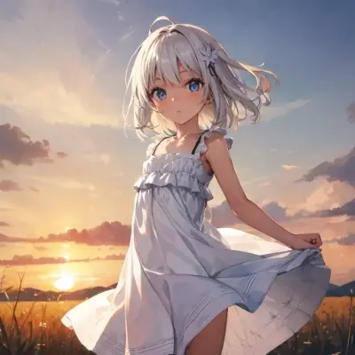 very cute female child,10 yo,white hair,bangs,medium hair,blue eyes,flat chest,hiking,