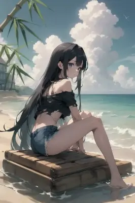 masterpiece, best_quality, ultra-detailed, extremely_detailed_eyes, delicate_and_intricate_hair, extremely_detailed_body, wide_shot, (from_side:1.2), (castaway:1.2), (building_log_raft:1.5), solo, 1girl, black_hair, (long_hair:1.5), (tired_hair:1.1), raised_eyebrows, black_eyes, parted_lips, bare_shoulders, small_breasts, ass, bare_legs, barefoot, soles, dirty_hair, dirty_face, dirty_body, serious, spoken_sweatdrop, black_shirt, short_shorts, (tattered_clothes:1.2), (torn_clothes:1.3), damaged_clothes, dirty_clothes, (survival:1.1), outdoors, day, (uninhabited_island:1.2), blue_sky, cloud, cloudy_sky, horizon, ocean, water, sand, shore, forest, small_log, wood_splinters, ivy, <lyco:flat2:-1>