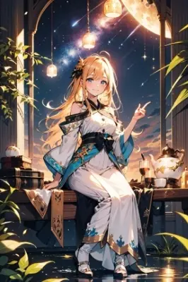 midnight, night, starry sky, (star:1.1), water, lake, park, flower, light particles:1.2, scenery, (outdoor:1.1),